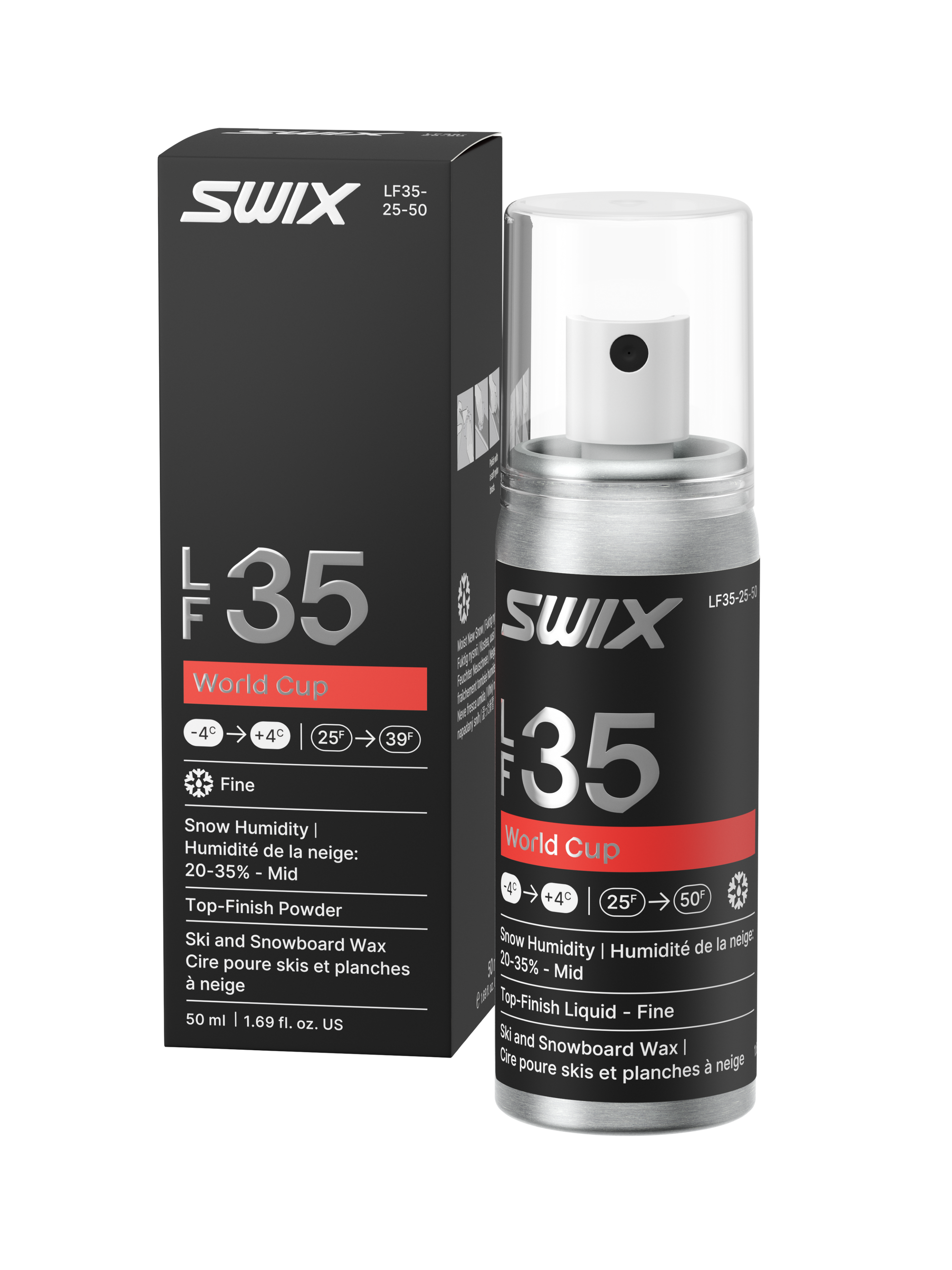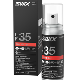 Le liquide de finition supérieure World Cup LF35 offre une excellente glisse dans des conditions de neige fine et fraîche aux alentours du point de congélation. LF35 utilise la technologie Swix Lotus pour créer un revêtement super lisse, hydrophobe et rapide qui minimise la zone de contact entre la base du ski et les particules de neige nouvelle moyennement sèche. PF35 fonctionne mieux sur la neige moyennement sèche avec une humidité entre 20 % et 35 %. Appliquez une couche uniforme sur le ski et polissez avec une brosse en nylon douce.